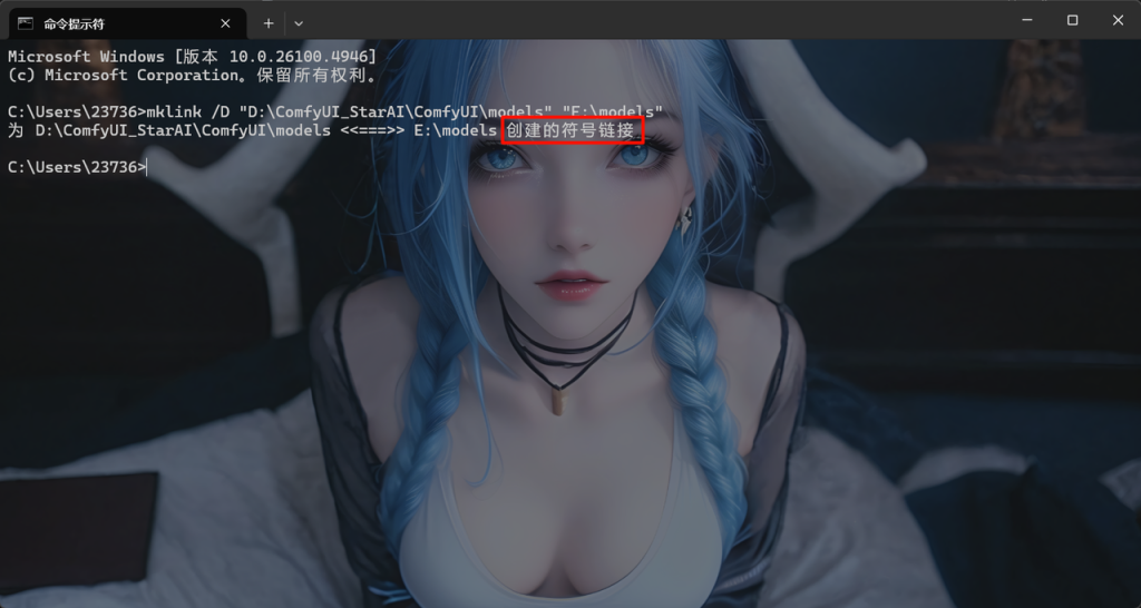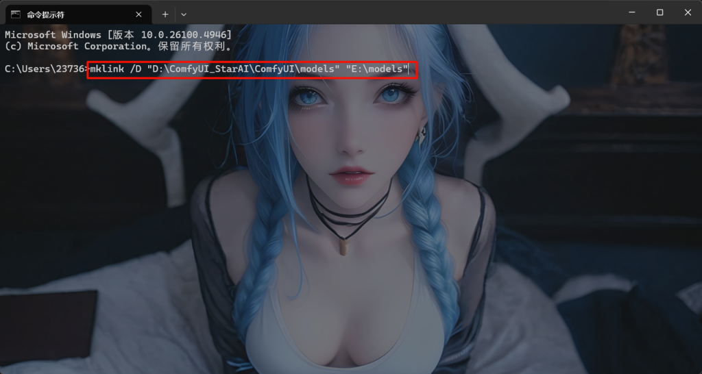 示例:mklink /D “替换为你自己ComfyUI模型路径” “替换为以后存放模型的路径”