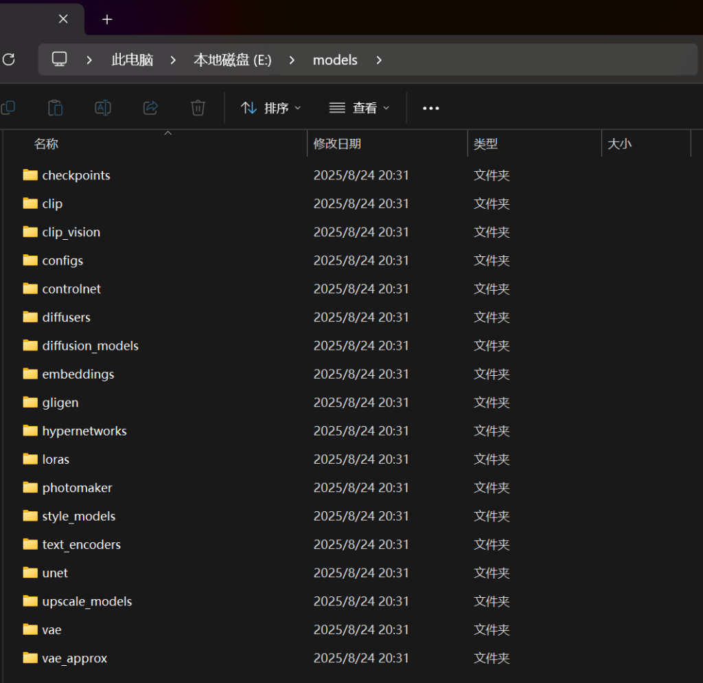 以后所有模型都可以存放在E:\models路径下,方便其他环境的comfyui调用