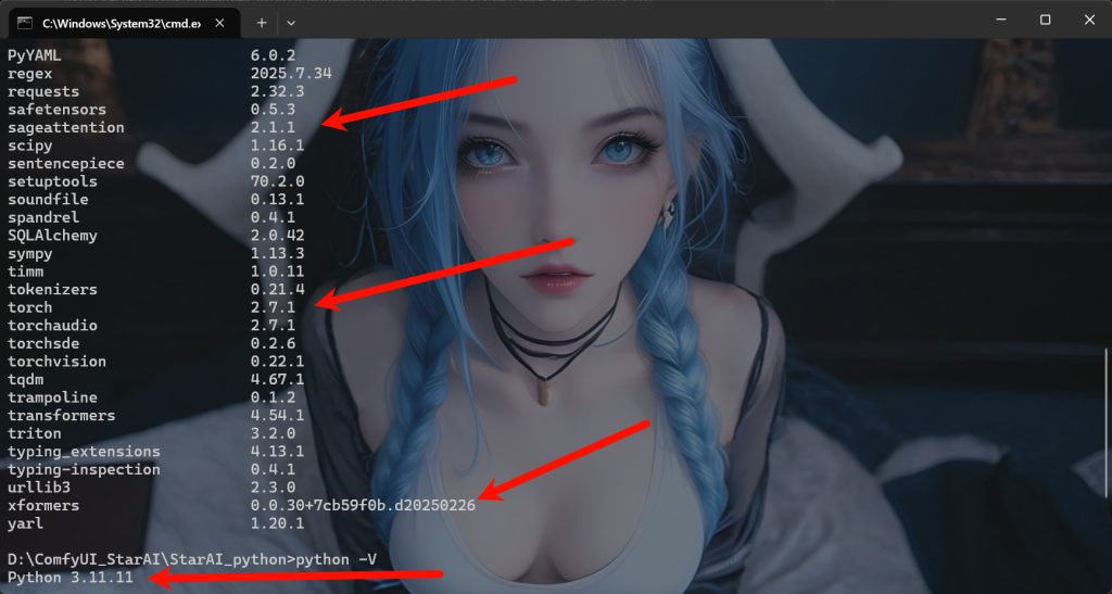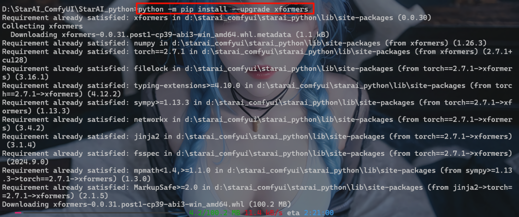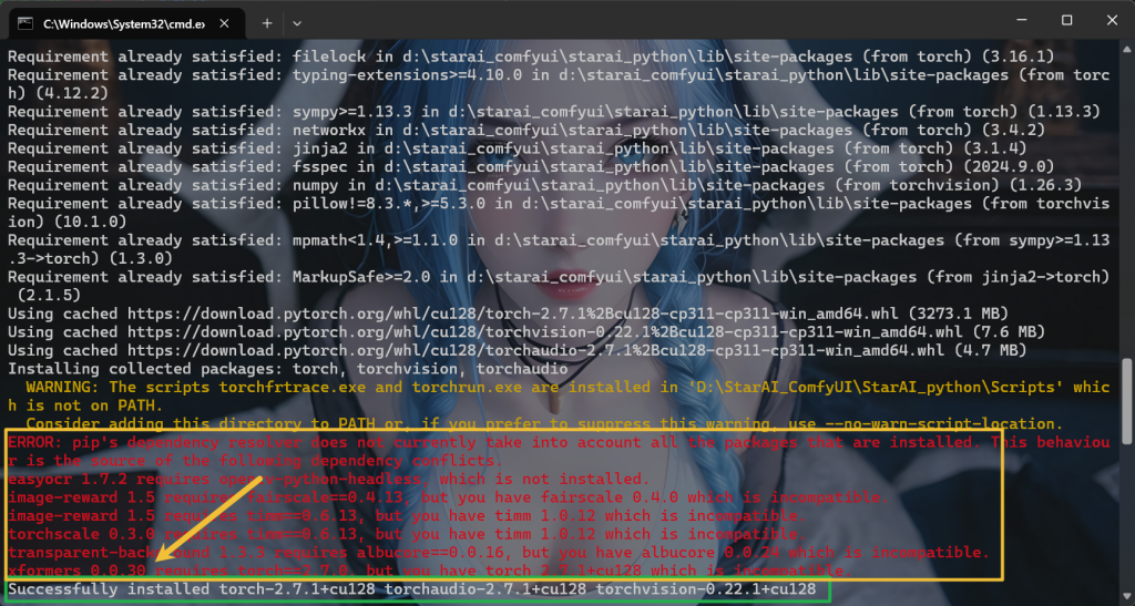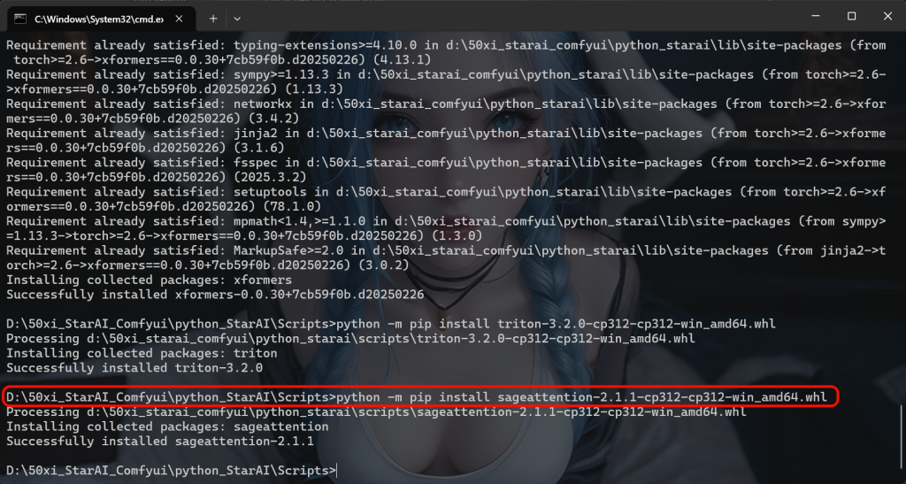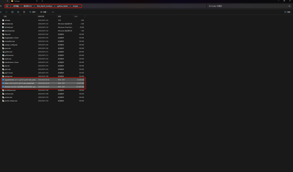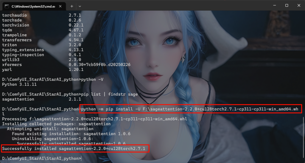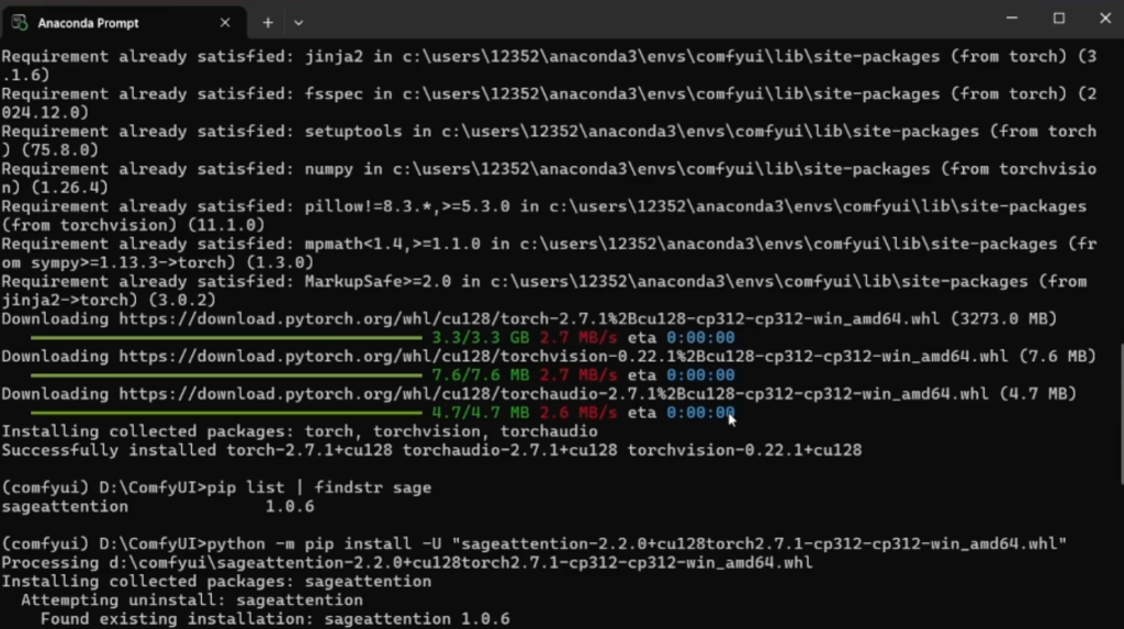 看到这样的提示说明安装完成了:Successfully installed sageattention-2.2.0+cu128torch2.7.1