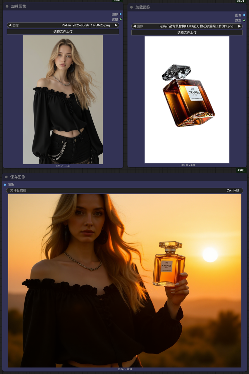 ✅ 虚拟试穿:上传模特+商品图,输入“让她拿着香水站在夕阳下”,光影融合超自然!